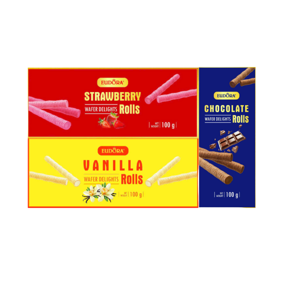 Bánh Quế Cuộn Kem EUDORA Hộp Giấy 100g là món bánh ngọt ngào và hấp dẫn với lớp bánh xốp mềm cuộn quanh nhân dâu, vani, socola thơm lừng. Sản phẩm mang đến hương vị thơm ngon, tiện lợi, phù hợp để thưởng thức hàng ngày hoặc làm quà tặng.
